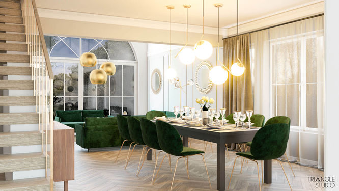 We wnętrzach przeważa elegancki styl glamour w ciepłym wydaniu w postaci złotych akcentów lamp i armatury. Całość projektu została też przełamana zdecydowanym, zielonym akcentem.